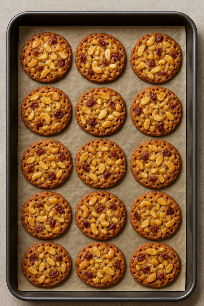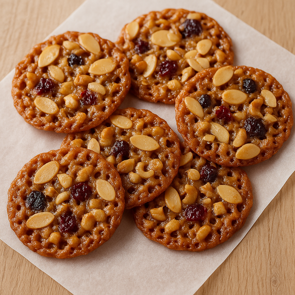Florentine cookies are lace-thin, crisp caramel treats made with sugar, butter, honey, and cream, then loaded with roasted nuts and dried fruit. As they bake, the mixture spreads and bubbles, creating a golden, delicate texture that’s simply irresistible.